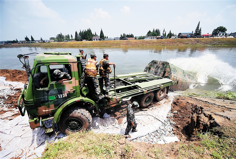 7月11日,抢险救援部队的战士们在现场搭建浮桥。 7月10日上午湖南省华容县新华垸发生溃口险情,截至10日21时,新华垸已有约2.36万人被转移。目前围堵溃口的抢险工作仍在紧张进行中。 新华社记者 李尕 摄