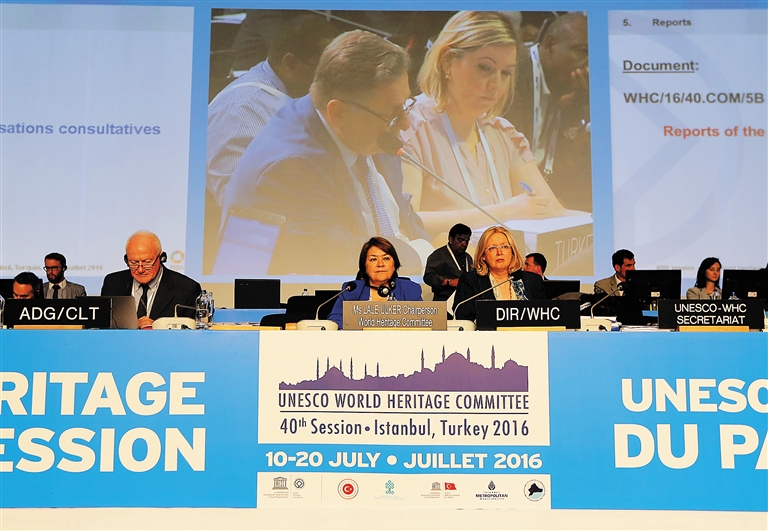 这是7月11日在土耳其伊斯坦布尔拍摄的第40届联合国教科文组织世界遗产委员会会议现场。 第40届联合国教科文组织世界遗产委员会会议(世界遗产大会)10日在土耳其伊斯坦布尔开幕,大会将审议包括中国湖北神农架、广西左江花山岩画在内的29个申遗项目,并将讨论阻止恐怖分子走私和摧毁文物的途径。 新华社/世界新闻通讯社