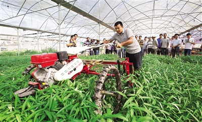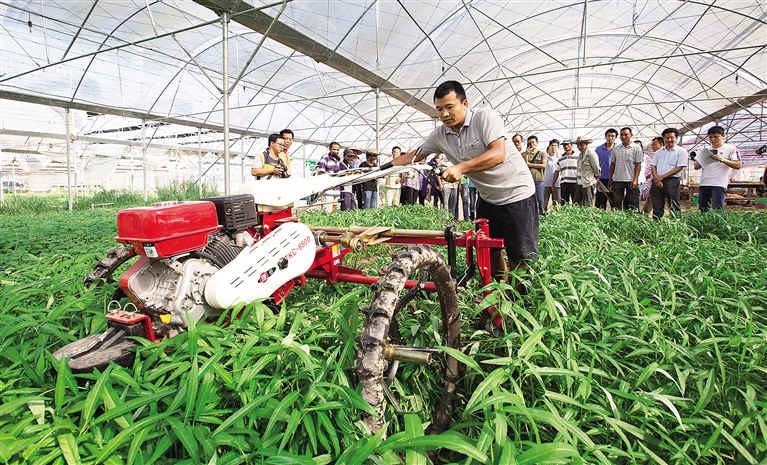 7月8日,南果蔬菜种植基地,三亚市南繁科学技术研究院工作人员正在演示操作蔬菜自动起根机。据了解,随着蔬菜自动起根机在收获空心菜的应用,海南首次实现空心菜种植、收获的全机械化作业。据介绍,经过大半年试验,三亚南繁院引进的蔬菜自动播种机和收割机初步试验成功。本报记者 武威 摄