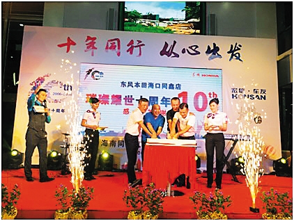 2006年7月,海南同鑫正式落户海口南海大道135号,十年来,东风本田海南同鑫店从最初销售的两款车型思域、CR-V,到现在的思域、CR-V、杰德、XR-V、思铂睿、思铭、哥瑞、艾力绅等共计8款车型,销量从单月的十几台、几十台一直到现在的月均销售超过200台。