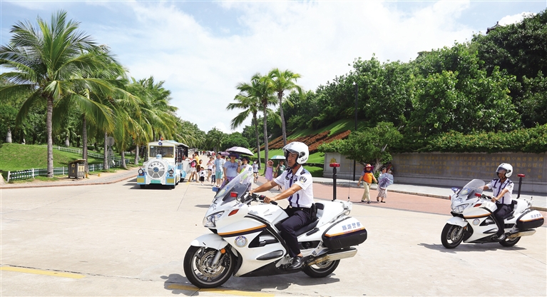 随着暑期的到来,三亚旅游市场逐渐升温,游人如织,旅游警察在各大游客聚集区值勤、巡逻,为游客“保驾护航”。