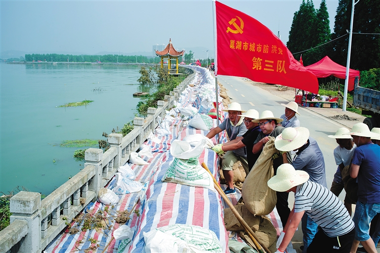 7月12日,安徽省巢湖市防洪党员突击队的党员在巢湖西坝口防洪堤旁加固一处防洪坝。 从7月初开始,安徽巢湖因持续强降雨影响,水位一直超保证水位。巢湖西坝口至龟山段临近巢湖市区,是该市防洪重点。从7月4日起,巢湖市将7公里的西坝口至龟山段责任到辖区57个单位,共700余人24小时轮岗巡线、加固堤坝,直至巢湖水位恢复正常。 新华社记者 郭晨 摄