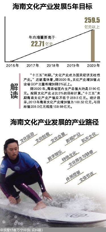 《报告》就海南“十三五”时期文化产业发展提出了四大方面的目标:一是文化产业总量和比重进一步提高,到2020年,文化产业增加值占全省GDP比重从目前的3.19%增加到5%以上;二是骨干文化企业进一步做大做强,特色文化产业彰显活力;三是文化经济政策体系进一步完善,文化治理体制机制不断创新;四是新型文化业态进一步创新,文化产业发展质量不断提高。