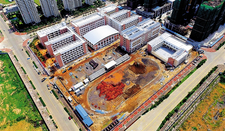 近日,在海口市秀英区长滨六路,建设中的海口市五源河学校已经进入收尾阶段,教学楼办公楼等建筑基本完工,目前正在铺设操场。五源河学校计划于今年秋季投入使用,共招生670人。本报记者 陈元才 实习生 陈若龙 摄
