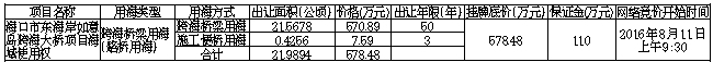 根据国家有关规定,经海口市政府批准,海口市海洋和渔业局决定以挂牌方式公开出让海口市东海岸如意岛跨海大桥项目海域使用权,现将有关事项公告如下:一、宗海基本情况: