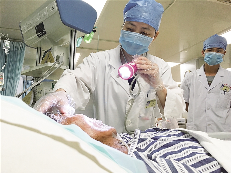 7月7日上午11时40分,乐东黎族自治县第二人民医院重症医学科约900平方米的病房里,数名医护人员密切监测着病床上患者的各项生命体征。这样的场景,也是该院重症医学科主任容美桑每一天的“常规动作”。