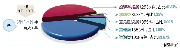 类似这样的例子还有很多。据了解,今年5月1日,省政府综合服务热线12345平台进入试运行阶段。5月1日至6月30日试运行2个月期间,共受理群众来电32205个,其中有效电话29365个,咨询类电话占八成,投诉举报类占比不到二成。7月1日,省政府综合服务热线12345平台正式运行。正式运行后投诉举报类来电显著提升,从7月1日-10日,投诉举报类共12536件,所占比重近50%。