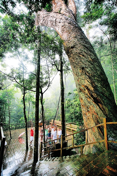 当车行至半山腰的雅加度假中心后下车步行,岭内建有“情道”“霸道”“天道”3条供游览、科考的木质攀登栈道,总长约4公里,栈道设计巧妙结合山体沟谷,热带雨林、瀑布溪流等景观资源,并融汇一体,让游客在清凉舒爽中体验原始生态的山野观赏。