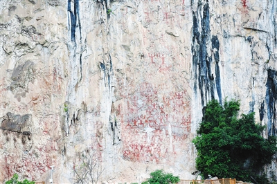 广西宁明县左江花山岩画(7月15日摄)。 7月15日,中国广西左江花山岩画艺术文化景观在第40届世界遗产大会上获准列入世界遗产名录。 经文物专家研究,花山岩画是战国至东汉时期当地壮族先民骆越人群体祭祀遗留下来的遗迹,距今有2000多年的历史,和与其依存的山体、河流、台地共同构成了壮丽的左江花山岩画文化景观。 新华社记者 周华 摄
