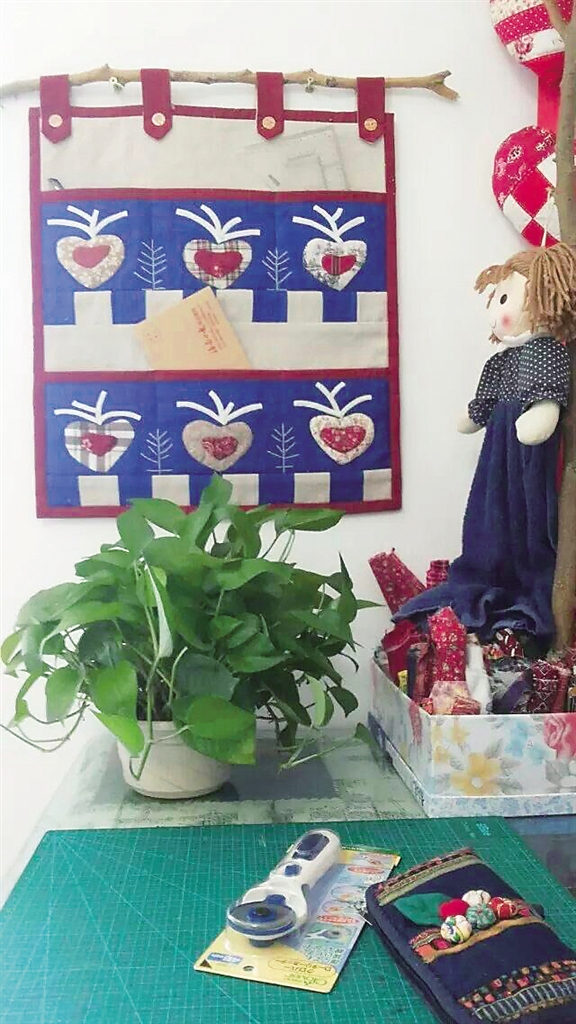 “一下子被橱窗里五颜六色的布艺作品吸引了,脚步在心的牵引下步入了拼布世界。”段晓凌从此与手工布艺结下不解之缘,在一针一线中找到了精神寄托。