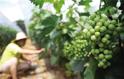 据介绍,去年11月初,儋州丰盛生态农业有限公司开建百亩葡萄园,从广西引进七月、红黑密嫩等6个葡萄品种种植获得成功。每棵藤控制6串葡萄约5公斤左右,一年可采收两季,亩产高达2000公斤。首季葡萄预计八月份上市。本报记者 苏晓杰 通讯员 黄艺媛 摄