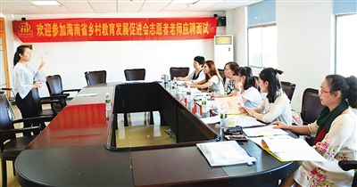 7月8日至9日,海南省乡村教育发展促进会在海口举行了2016年度支教老师招募面试会,今年秋季开学后,他们计划为海南33所乡村学校委派50位志愿者教师。据记者了解,本次招聘仅有30名左右面试者合格,对此,省乡村教育发展促进会相关负责人呼吁,希望有更多年轻学子参与乡村教育事业,为海南乡村教育献力。