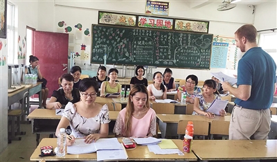 7月15日下午,海口琼山二小感恩楼六楼的多媒体教室里座无虚席,2016琼山区小学英语教师暑期口语集训结营会正在这里进行,一部部由琼山区各学校英语老师自己编排表演的“童话大戏”在舞台中央轮番上演,望着台上老师们创新改编的精彩表演,坐在台下的口语集训创办者王正俊感到欣慰。