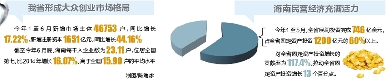 “海南深化商事登记制度改革,便利市场准入,鼓励投资创业,激发市场活力,形成大众创业、万众创新的市场格局,推动海南民营经济快速发展。”省工商行政管理局局长陈楷说,今年1至6月新增市场主体46753户,同比增长17.22%,新增注册资本1651亿元,同比增长44.16%。到6月底,海南每千人企业数为23.11户,位居全国第七,比2014年增长16.07%,高于全国15.90户的平均水平。