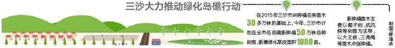 这只是三沙力争建设成为浪花上的花园城市的一个缩影。三沙市国土资源局负责人史国宁表示,今年三沙岛礁的绿化力争精益求精,做出一岛一特色,组织专家对各个岛礁进行科学调研,规划选择适合各岛礁生长的树种,引进适合各岛礁生长、还能结出果实的热带果树品种。