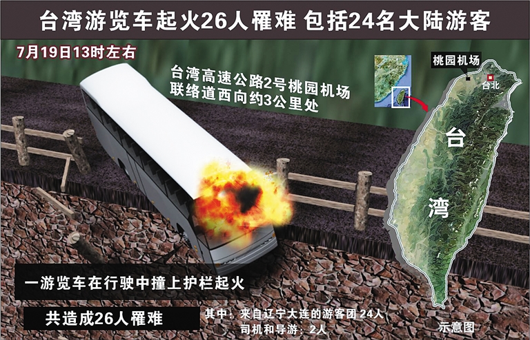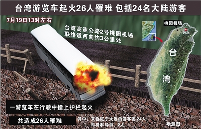 新华社台北7月19日电 一大陆旅行团乘坐的游览车19日中午在台湾桃园发生严重车祸和火灾,造成26人罹难,其中包括24名大陆游客。