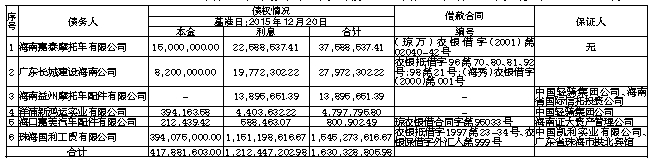 根据中国农业银行股份有限公司海南省分行与中国长城资产管理公司海口办事处达成的债权转让安排,中国农业银行股份有限公司海南省分行将其对公告清单所列借款人及其担保人享有的主债权及担保合同项下的全部权利,依法转让给中国长城资产管理公司海口办事处。中国农业银行股份有限公司海南省分行特公告通知各借款人及担保人。中国长城资产管理公司海口办事处作为上述债权的受让方,现公告要求公告清单中所列债务人及担保人,从公告之日起立即向中国长城资产管理公司海口办事处履行主债权合同及担保合同约定的还本付息义务或相应的担保责任。特此公告。