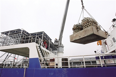 2008年2月2日,停靠在清澜港海事码头的“琼沙3号”轮,吊机在吊运生活物资。 |
