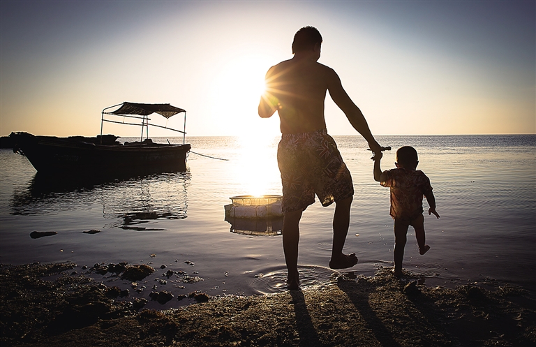 | 三沙渔民许名文陪儿子在海边玩耍。自古以来,一代代海南渔民子承父业耕耘祖宗海,守护美丽家园。