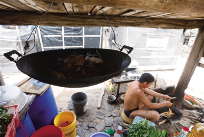2013年7月14日,三沙市赵述岛,一位居民在一间用木条、防雨布搭建的简易房下做饭。 |