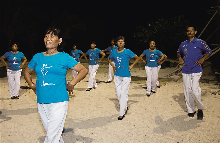 | 2015年6月8日,三沙市赵述岛,居民身着统一的服装跳起了广场舞。 |