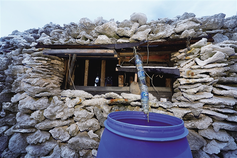 2013年5月31日,三沙市赵述岛上,渔民在接雨水。过去,三沙岛礁上军民依靠收集雨水作为饮用水。 |