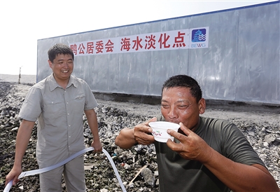 | 2014年1月2日,三沙市永乐群岛管委会鸭公岛社区居民许德轩(右)在品尝刚生产出来的海水淡化水。当天,这里的海水淡化装置生产出了第一口海水淡化水。 |