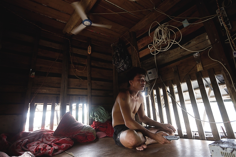 2013年7月14日,三沙市赵述岛,渔民在木屋中休息。除了打鱼,渔民多数时间都是在简易房内休息。 |