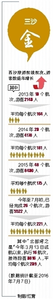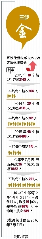 三沙市政府提供的一组数据显示,西沙邮轮旅游自2013年4月28日正式开通以来,逐步稳定发展,邮轮的执行航次、游客的接待量以及单个航次的游客接待人数都呈逐年提高的发展状态,截至2016年7月22日,西沙邮轮旅游共执行了114个航次,接待游客1.93万人次。