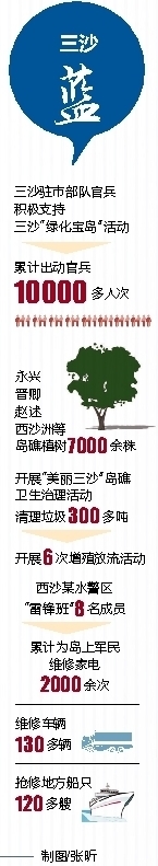 为了让美丽三沙更美丽,三沙驻市部队官兵积极支持三沙实施“绿化宝岛”活动,累计出动官兵1万多人次,在永兴、晋卿、赵述、西沙洲等岛礁植树7000余株;开展“美丽三沙”岛礁卫生治理活动,清理垃圾300多吨,开展6次增殖放流活动,有力保护了永兴岛海域海洋生物多样性。