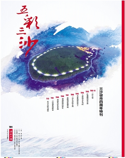 特刊共12个版,内容丰富、编排新颖。围绕三沙成长历程,创新性地用红、橙、金、绿、蓝五种颜色来描绘三沙的主要发展亮点。其中,庄严的红色代表政权建设,活力的橙色代表民生事业,富贵的金色代表产业发展,希望的绿色代表生态保护,而那海天一体、最广阔的蓝色,则代表三沙军民鱼水一家亲,共同融入这片神圣的蓝色国土。此外,还有一个图片跨版和一个大事记版面,用大量鲜活生动的照片和简明扼要的梳理,真实地展现三沙在交通、生态、教育、生活等方方面面发生的巨大变化。而这一切变化,都离不开默默奉献、不畏艰险的三沙人,为此,特刊还以一个整版的形式,对三沙先进典型这一群像进行勾勒和速写。敬请关注。(详见今日T01版—T12版)