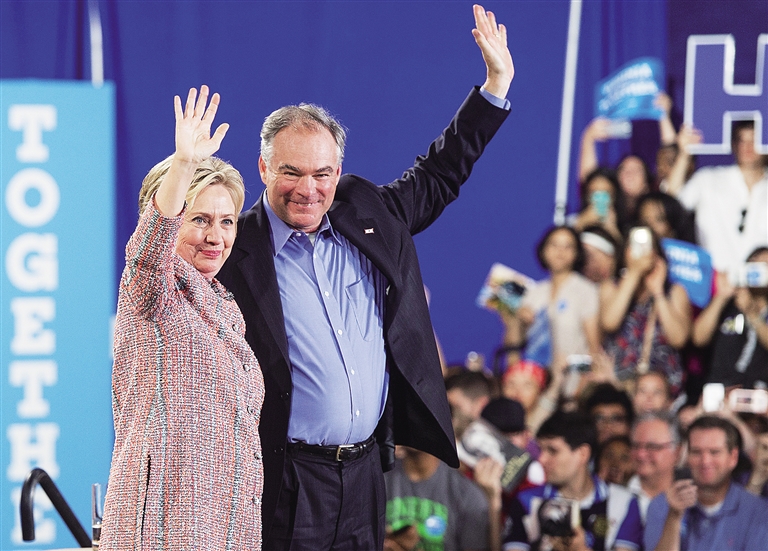 7月22日,美国民主党总统竞选人希拉里·克林顿宣布弗吉尼亚州联邦参议员蒂姆·卡因为自己的竞选搭档。 这是7月14日希拉里·克林顿(左)与蒂姆·卡因在弗吉尼亚州安嫩代尔参加竞选集会的资料照片。 新华社/法新