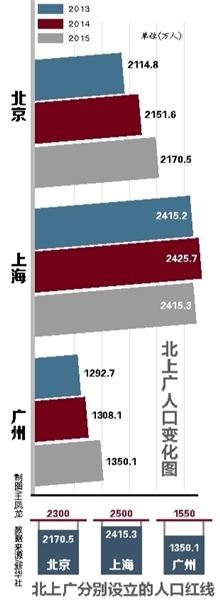 截至2015年末,北京、上海、广州常住人口总数达近6000万人。但随着这几个城市相继提出人口控制和疏解的政策,去年,北上广等城市隐现“人口拐点”的信号。北上广三地政府今年上半年陆续公布的常住人口数据显示,北京出现核心区人口减少,上海出现人口负增长,广州出现人口增速阶段性放缓。