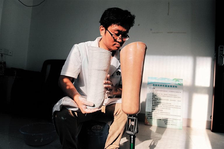 工作了10多年的王春,制作并装配假肢千余例,让千余名肢残人受益。他说:“免费安装假肢的残疾人都相对贫困,致残后他们还要继续劳动,假肢的磨损程度都比较严重,为了让残疾人在穿戴假肢后不磨损残肢伤口,取型时很关键,取型和制作都要一个人完成,负责到底”。
