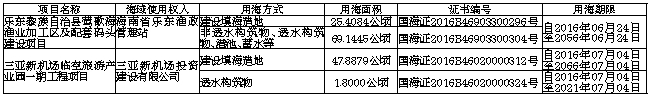 根据《中华人民共和国海域使用管理法》和《海南省实施〈中华人民共和国海域使用管理法〉办法》有关规定,海南省乐东渔政管理站位于乐东黎族自治县莺歌海镇附近海域的乐东黎族自治县莺歌海渔业加工区及配套码头建设项目海域使用权和三亚新机场投资建设有限公司位于三亚红塘湾附近海域的三亚新机场临空旅游产业园一期工程项目海域使用权已经海南省人民政府批准出让,予以登记,颁发海域使用权证书。现公告如下: