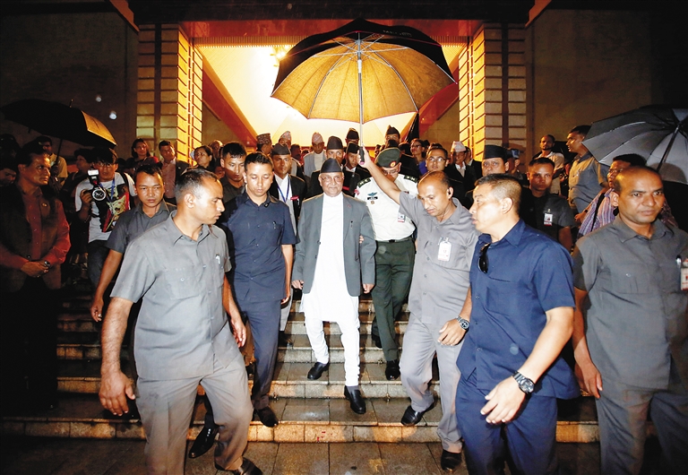 7月24日,在尼泊尔加德满都,尼泊尔总理、尼泊尔共产党(联合马列)主席奥利(中)宣布辞职后离开议会。 奥利当晚在制宪会议(议会)演讲时正式宣布辞去总理职务。 新华社/路透