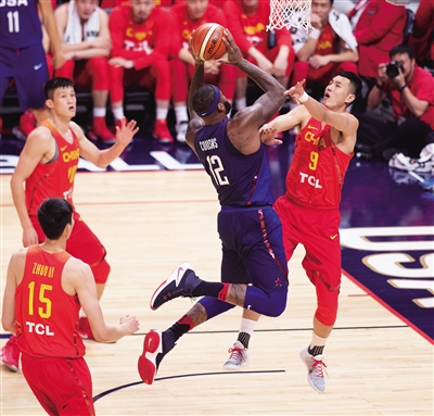 图为中国队球员翟晓川(右一)在比赛中防守美国队球员德马库斯·考辛斯的上篮。 新华社发