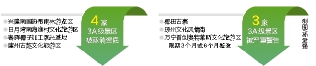 依照相关管理办法,评定委员会决定取消兴隆南国热带雨林游览区、日月湾南海渔村文化旅游区、春晖椰子加工观光基地、崖州古越文化旅游区等4家3A级旅游景区资质。给予椰田古寨、琼州文化风情街和万宁首创奥特莱斯文化旅游区等3家3A级景区严重警告,限期3个月或6个月整改。
