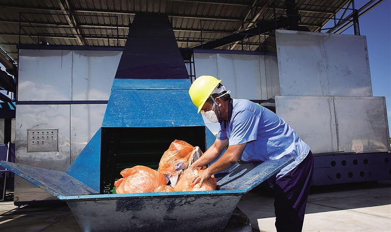 7月23日,在三沙市永兴岛环保中心,工人将已分类的垃圾投入垃圾热能处理设备。当天上午,三沙市永兴岛的垃圾热能处理设备开始运行,对生活垃圾、餐厨垃圾、有害垃圾等可燃垃圾进行热能分解燃烧处理,垃圾减量化可达95%-97%。本报记者 宋国强 摄