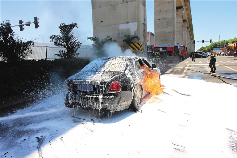 12时57分,海口市119指挥中心接到报警。接到报警后海口消防特勤二中队官兵立即赶赴现场进行处置。消防官兵到场后发现,南海大道行车道上一辆劳斯莱斯轿车车底与车头着火,火势较大,无人员被困。