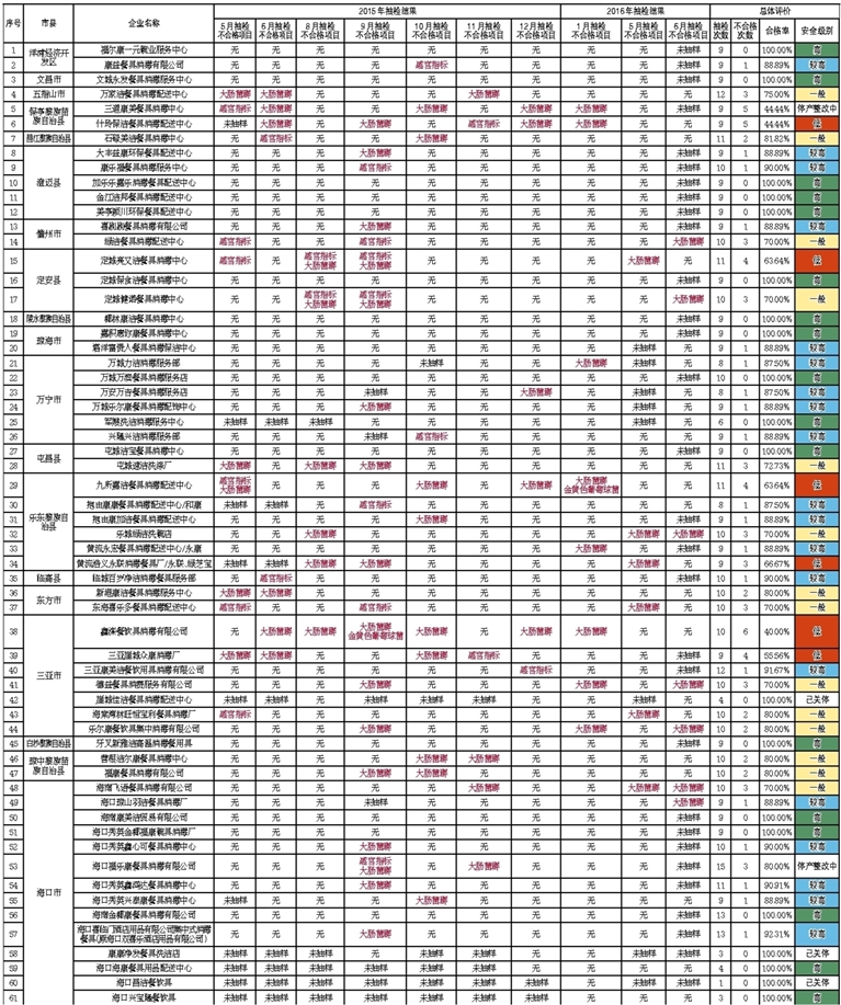 自2015年5月海南省食品药品监督管理局介入餐饮具集中消毒企业的监管以来,已连续开展了10余次专项整治行动,彻底扭转了集中消毒餐饮具抽检不合格率高达21%的局面。现将2015年5月到2016年6月全省集中消毒餐饮具的历次抽检结果予以公告,请各餐饮企业优先从安全级别高的餐饮具消毒企业采购集中消毒餐饮具。