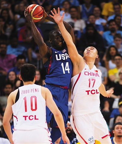 7月26日,在美国奥克兰进行的一场热身赛中,中国男篮客场以57:107不敌美国男篮。这是中国男篮为备战里约奥运会与美国队进行的第二场热身赛。图为中国队球员贾诚(右)防守美国队球员格林。 新华社发