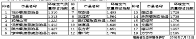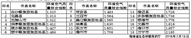 2016年6月全省18个市县(三沙市除外)城市(镇)环境空气质量排名如下: