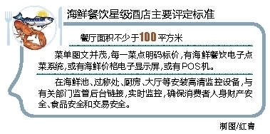 《海鲜餐饮星级的划分与评定》规定,海鲜餐饮星级从高到低依次为五星级、四星级、三星级、二星级、一星级,用海星的数量来表示等级,5只海星表示五星级。餐厅面积不少于100平方米,菜单图文并茂,每一菜点明码标价,有海鲜餐饮电子点菜系统,或有海鲜价格电子显示屏,或有POS机。