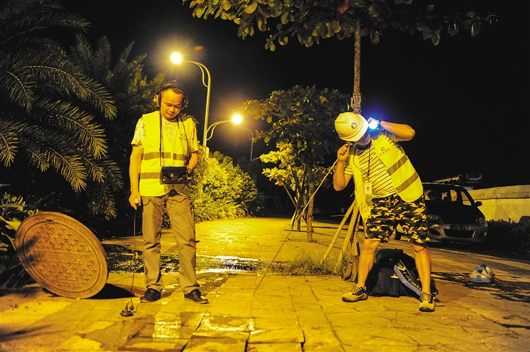 据海口威立雅水务管网运行部范高哲介绍,听漏是为了找到地下水管是否渗漏,防患未然。听漏需要在安静的深夜进行,因为深夜杂音少,用水量也小,听漏效果最佳。2015年,听漏工巡查管线约1600公里,发现364处漏点,处理应急捡漏单531起,为海口市节水约1600万吨。 本报记者 袁琛 摄