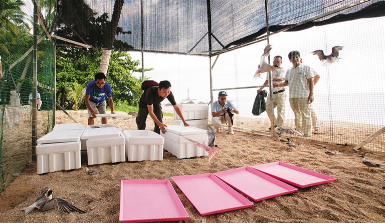 2016年3月,三亚蓝丝带海洋保护协会正式启动“三亚召回海鸥行动”,计划从青岛引入44只燕鸥亚成鸟,希望通过驯化放飞的方式,招引更多的燕鸥、海鸥来三亚,甚至留栖。