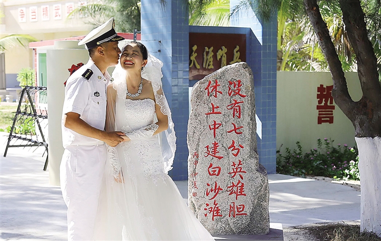 没有镁光灯,没有化妆师,但中建岛上有婆娑椰林、碧蓝海水,有“南海戈壁”铭志石,还有酷炫的沙滩摩托……岛上这些自然和人文风光全部成了婚纱照中的场景。