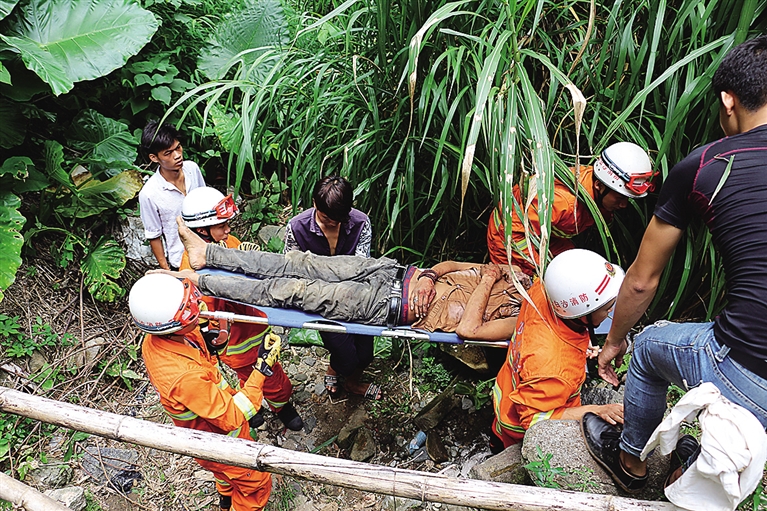 5分钟后,消防官兵赶到现场,发现有一名青年男子体表有明显外伤,意识清醒但无法动弹,头部受伤严重,其旁已有120救护车医生在为其安抚情绪。经过现场勘查与咨询医生意见,4名消防战士利用多功能担架在现场医生的指导下转移伤者,13时07分,伤者安全转移到救护车旁。