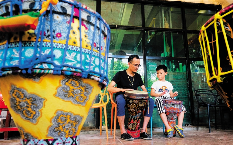 7月31日,澄迈县福山咖啡风情镇,十多个孩子在学习打非洲手鼓。暑期中,在玩中学习是多数家长和孩子们容易接受的一种暑假生活。本报记者 宋国强 摄
