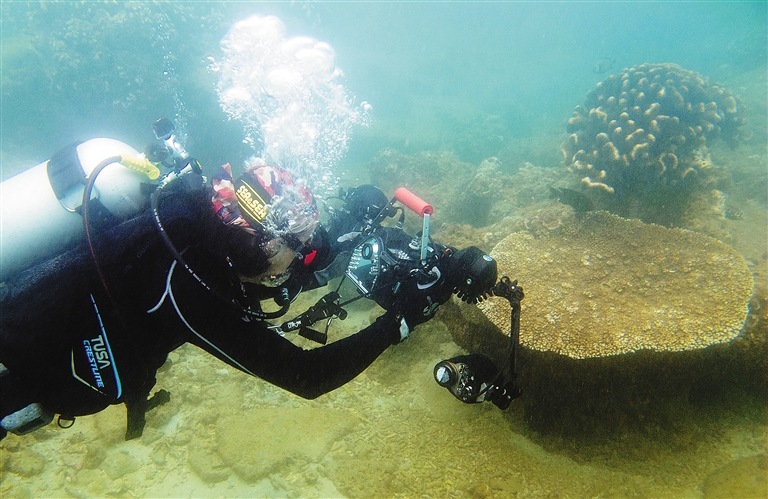 “潜水的乐趣在于,你不知道下一刻会遇到什么,有可能是‘西班牙舞娘’,也有可能是一只小鲨鱼!” 海南省贝类与珊瑚保护学会会长姚宏朝在水下拍个不停。回到岸上他刚打开手机,微信里就有朋友向他讨要新作品了。